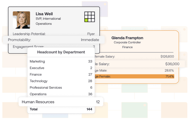 Easily create custom formulas and calculations to surface key insights related to employee performance, salary, DEI, and more to drive informed decisions with real-time data.