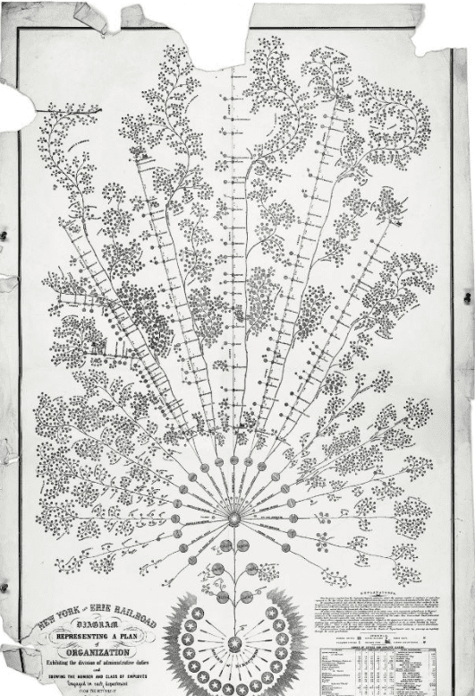 The origin of the organization chart dates back to the mid-1800s, at a time of expanding railroad businesses. Notably, the Erie Railroad was a thriving but extremely disorganized company responsible for transporting goods throughout the Northeastern United States. At this time most railroad companies covered short distances. But the Erie Railroad company had more than 500 miles of track, which was one of the largest of its time. The Erie Railroad business continued to expand but chronic disorganization was seriously impeding its performance.