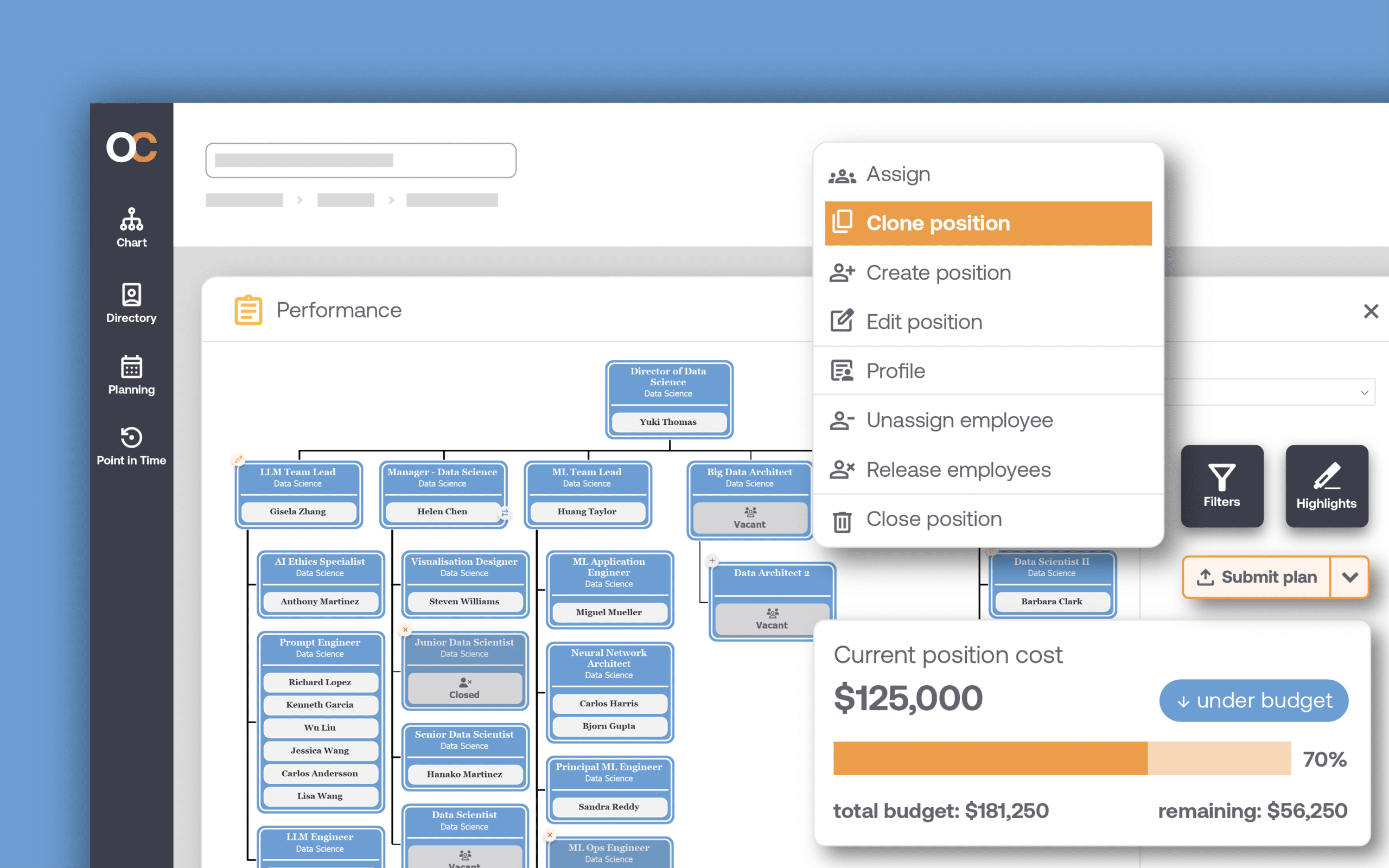 Our software is priced based on the number of unique employee records you are charting, what package you need, and the length of your contract.