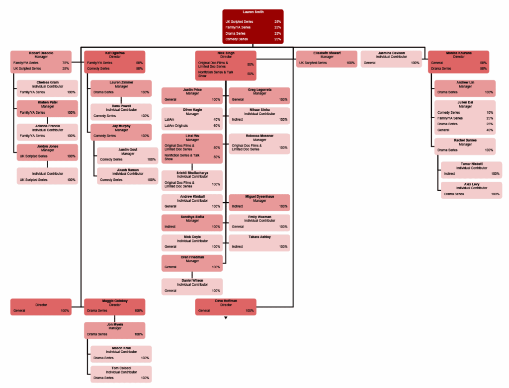That’s where a visual workforce planning solution can add value. In this example, we helped one of the biggest entertainment companies in the world solve a problem that they had previously spent hours trying to fix manually.. This company periodically produced allocation charts to better understand the project allocation for directors and their reports. Instead of adding this information manually, OrgChart pulled directly from WorkDay via its integration. Groupings and calculations created org charts that clearly showed the allocation of resources to each project within the hierarchical structure of the company. The charts also showed open requisitions, allowing HR to clearly see hiring gaps that could hold up projects or teams.