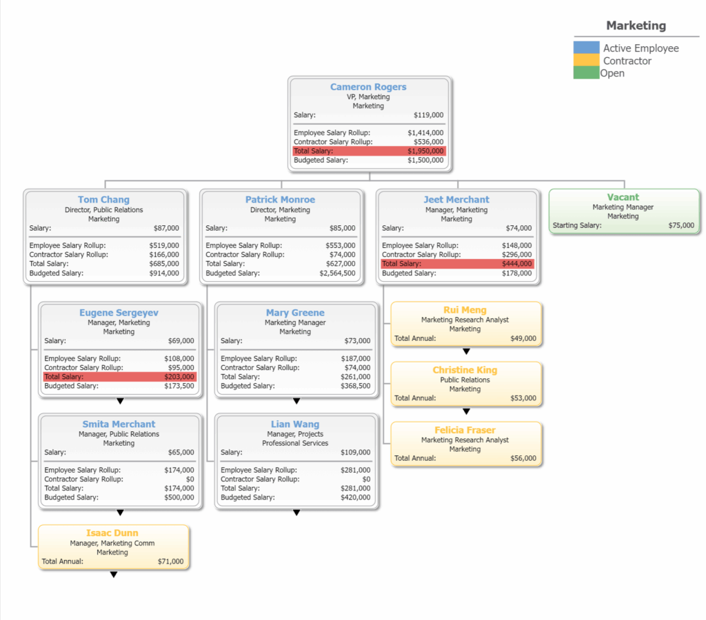 Understanding your organization’s salary and headcount rollup is essential for managing costs effectively. OrgChart allows you to create custom formulas that simplify this process by totaling employee salary costs by the entire organization, business unit, division, or department.