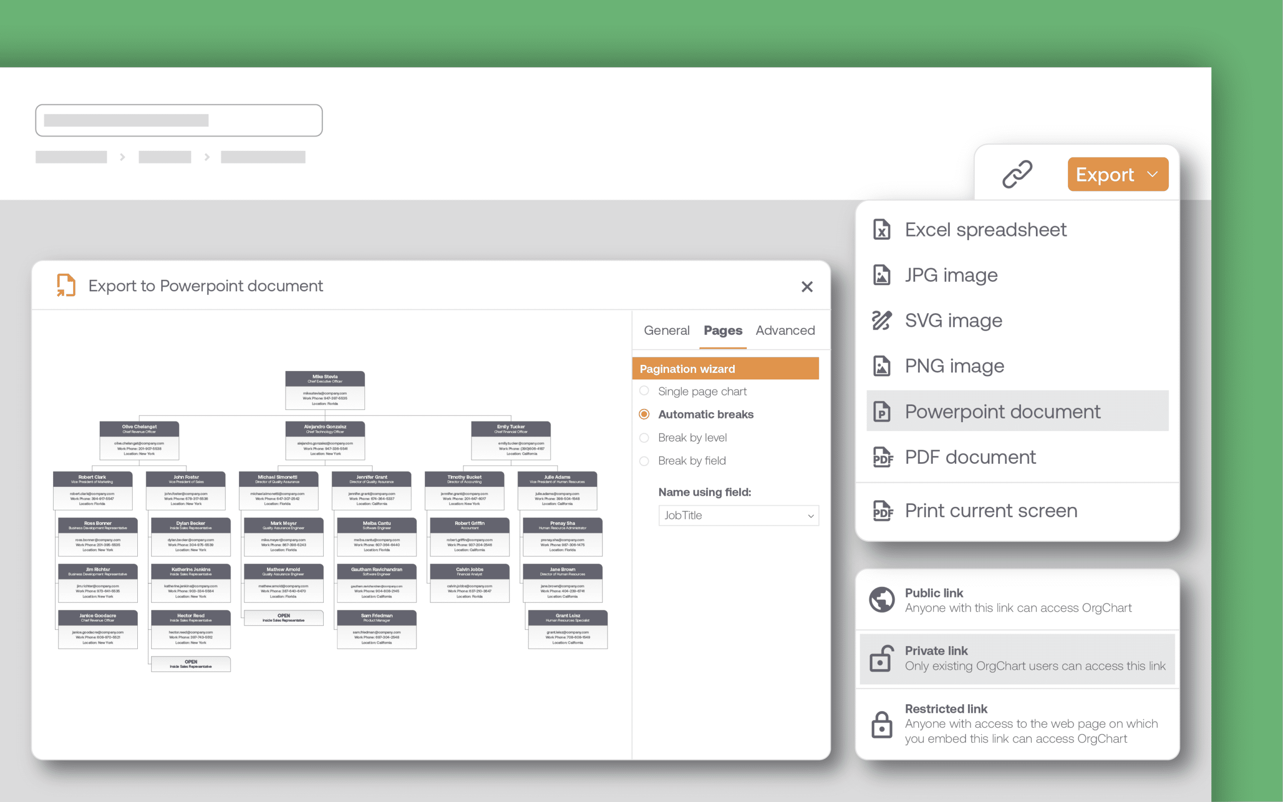 Export org charts to PowerPoint, PDF, or shareable links in seconds.