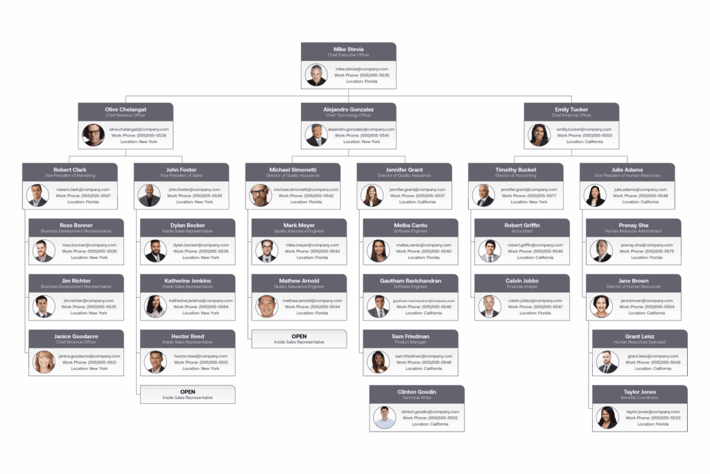 OrgChart provides unparalleled visibility into your personnel and surfaces valuable insights for strategic decisions (now and in the future). Access detailed information such as employee roles, contact information, performance metrics, and more.